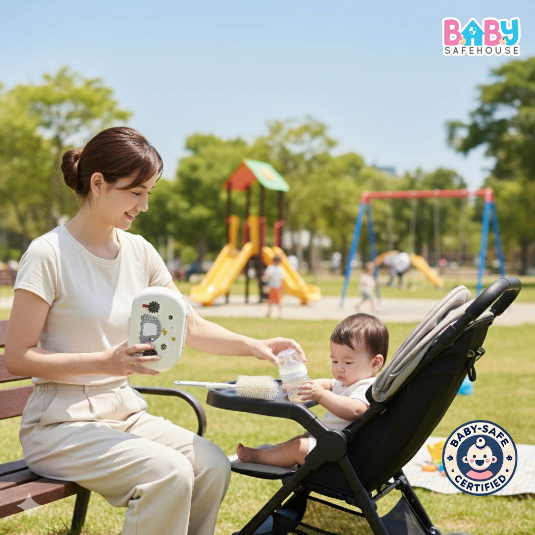 Portable bottle cleaning brush set for travel and outdoor use. Keeps baby feeding items clean on the go.